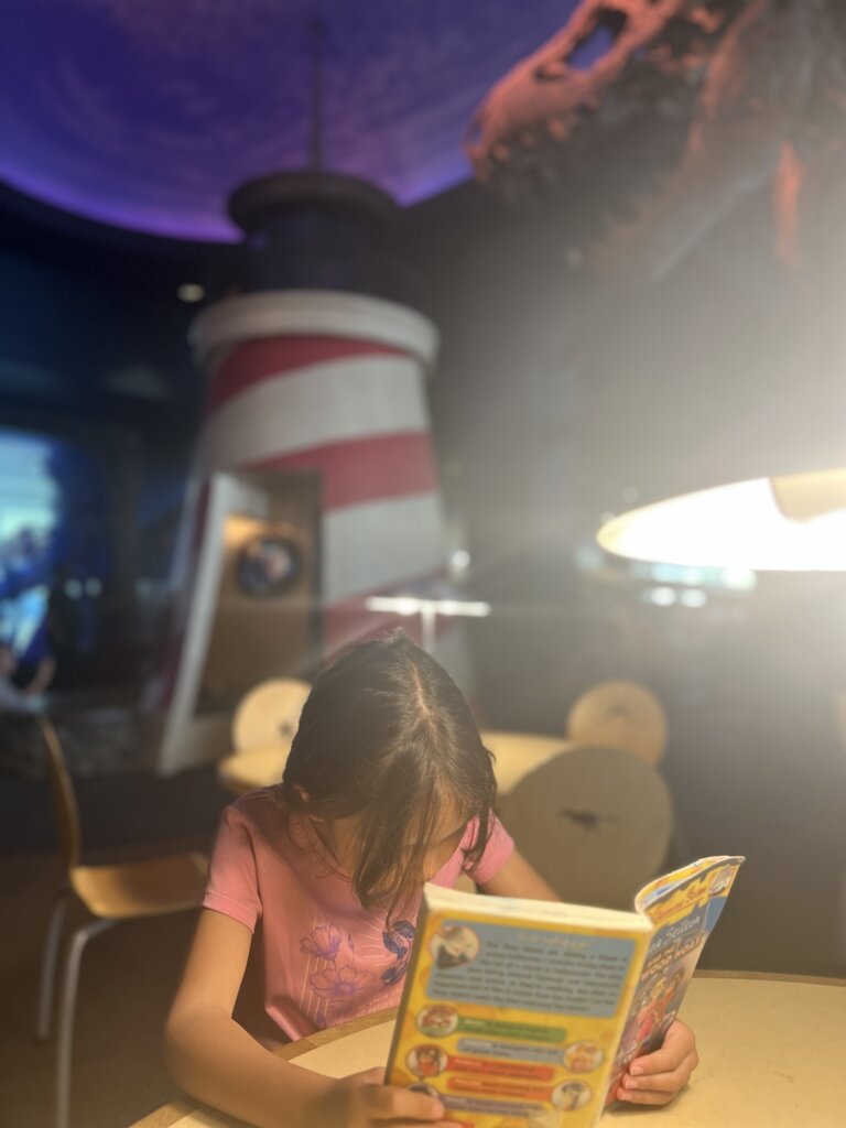 Just on the other side of the aquarium is the kid’s section. A giant book archway welcomes you to a world of imagination. It might be overwhelming at first, but give yourself time take it all in. From a lighthouse seating area, massive tree with branches overhanging, a 40-foot Tyrannosaurus Rex fossil replica, space shuttle and more to discover; There is a space for everyone to settle in with a good book. They also offer a computer lab with kid friendly games and quiet spaces for homework.